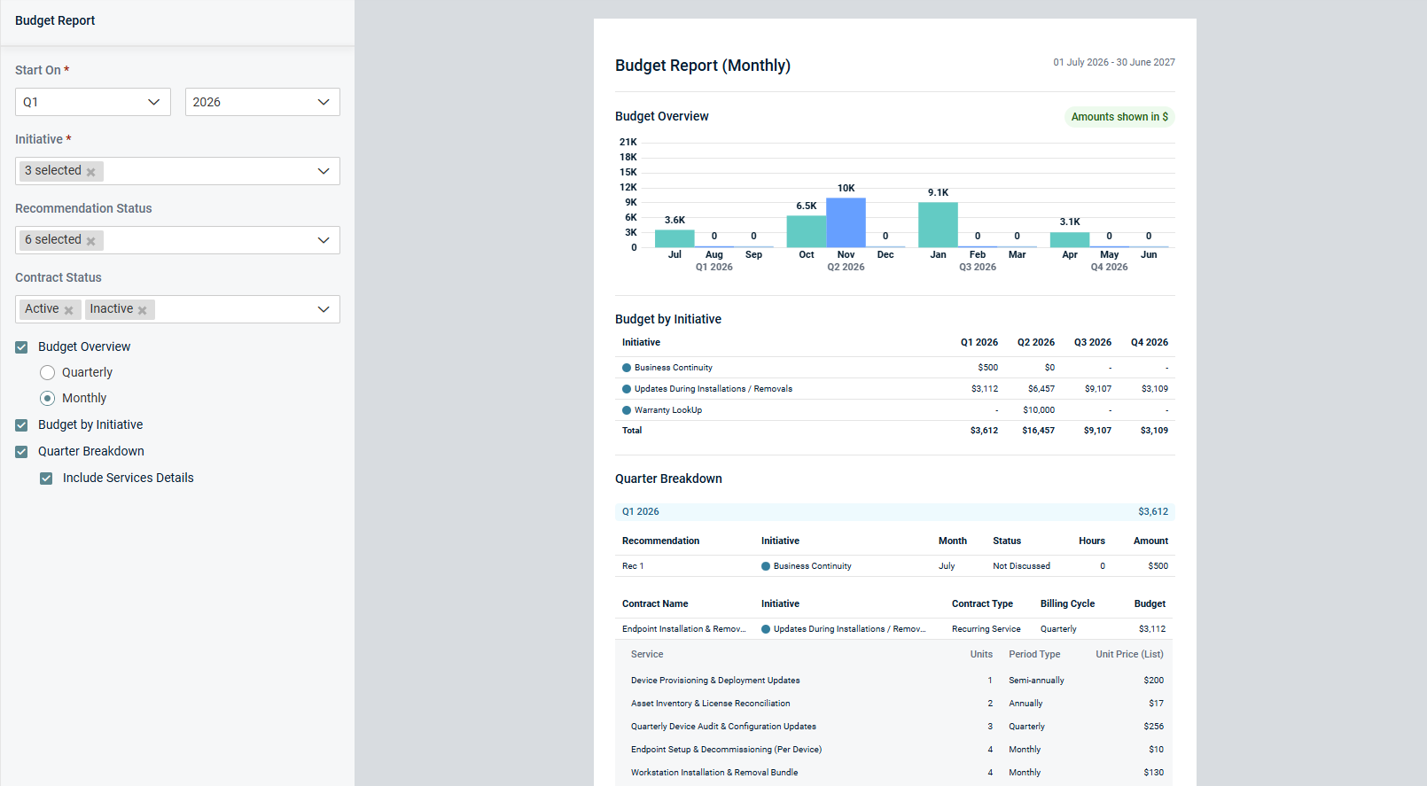 The Budget Report section in the QBR Report Builder now offers enhanced customization options, giving you greater flexibility when preparing data for clients. Additional filters allow you to refine data by initiative, recommendation status, and contract status, with defaults ensuring all options are included unless otherwise specified. The Budget Overview can be configured to display either quarterly or monthly data, and the Quarter Breakdown can be configured to show or hide service details for contracts.