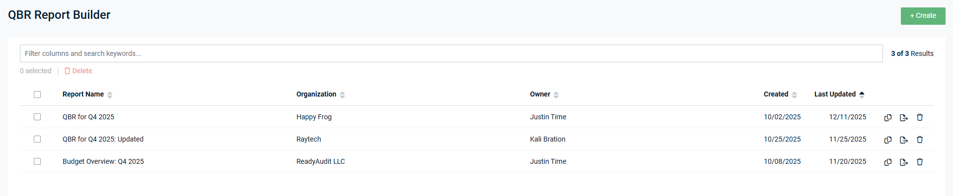 On the QBR Report Builder page, the list of saved QBR reports displays the following fields for each report: