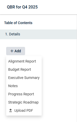 In the Details tab in the QBR Report Builder, you can customize the following cover page elements: