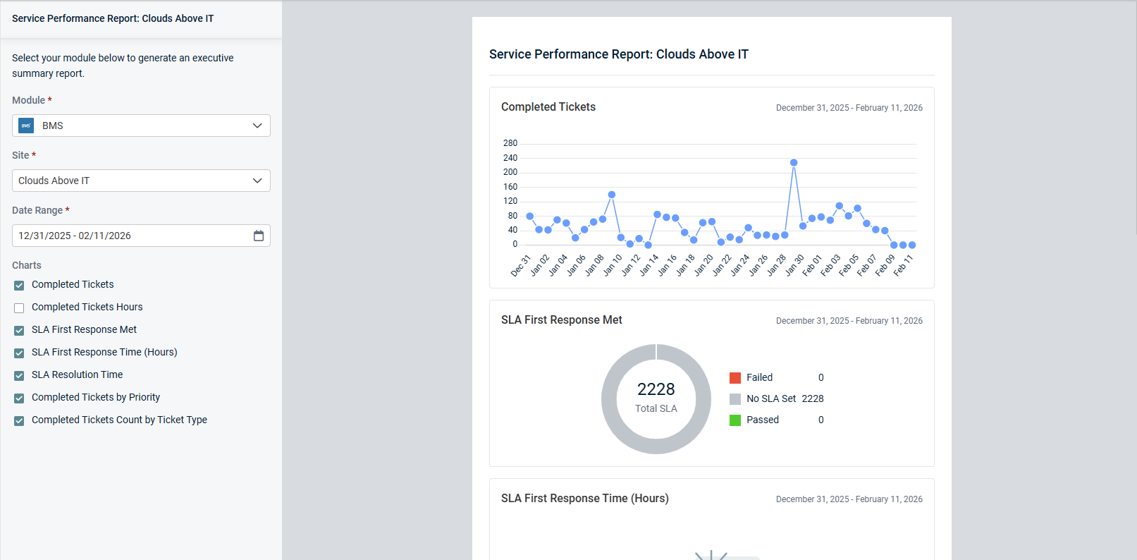 This metric is calculated for completed tickets on any given day where a ticket has an SLA first response configured. A pass or fail SLA first response met is calculated by comparing the SLA first resolution due date/time vs. when the ticket status change date/time that marks this SLA as met. Any completed tickets where no SLA first response has been configured will be excluded from this metric.