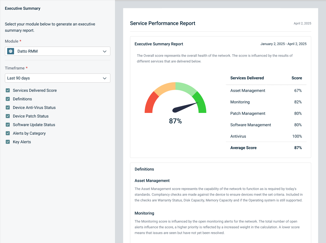Creating an Executive Summary report for Datto RMM gives visibility into the service delivery level by providing a score based of:
