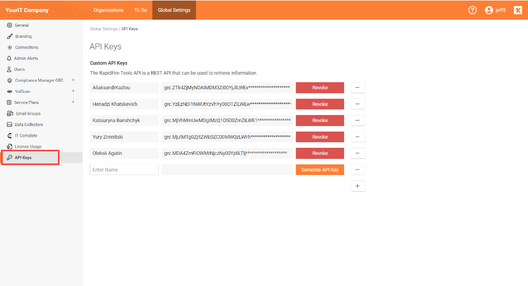 Generate an API from Compliance Manager by going to Global Settings > API Keys > Generate API Key.