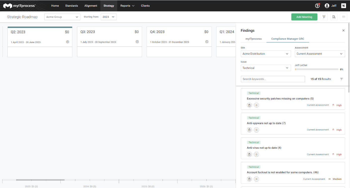 Go to Strategy on the menu bar and select a client you have mapped and has generated a Plan of Action & Milestones. Click the Findings button and then the tab for Compliance Manager GRC.