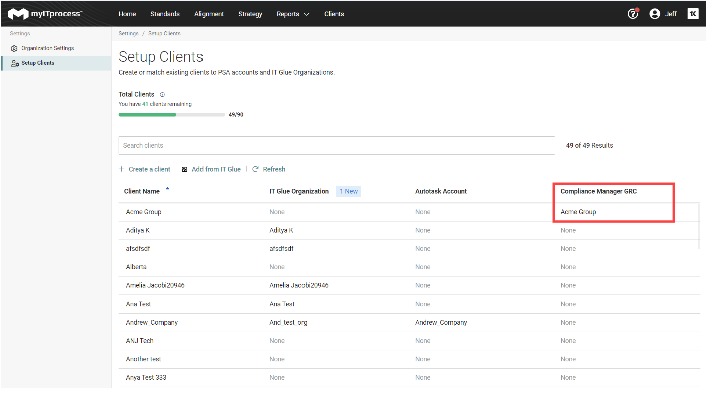 Once you successfully connect your API go to Setup Clients. Auto-matching of clients is employed if the client name in myITprocess and the organization name in Compliance Manager match 100%. You can also click the dropdown menu for the Compliance Manager GRC column header and map your clients manually. *Remember to click Save.