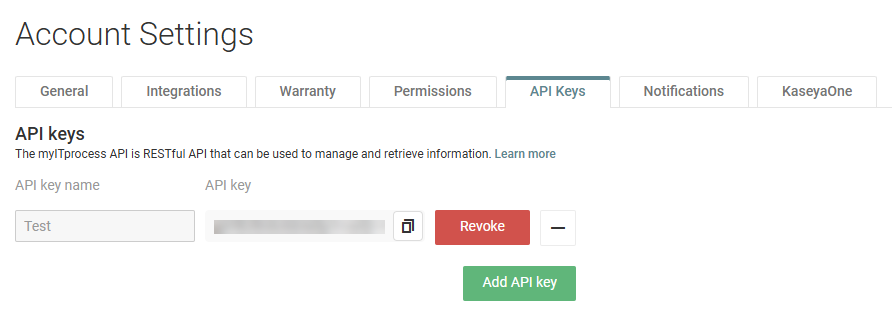 To authenticate API requests to myITprocess, you must generate an API key. The API key identifies your account and authorizes access to the API.
