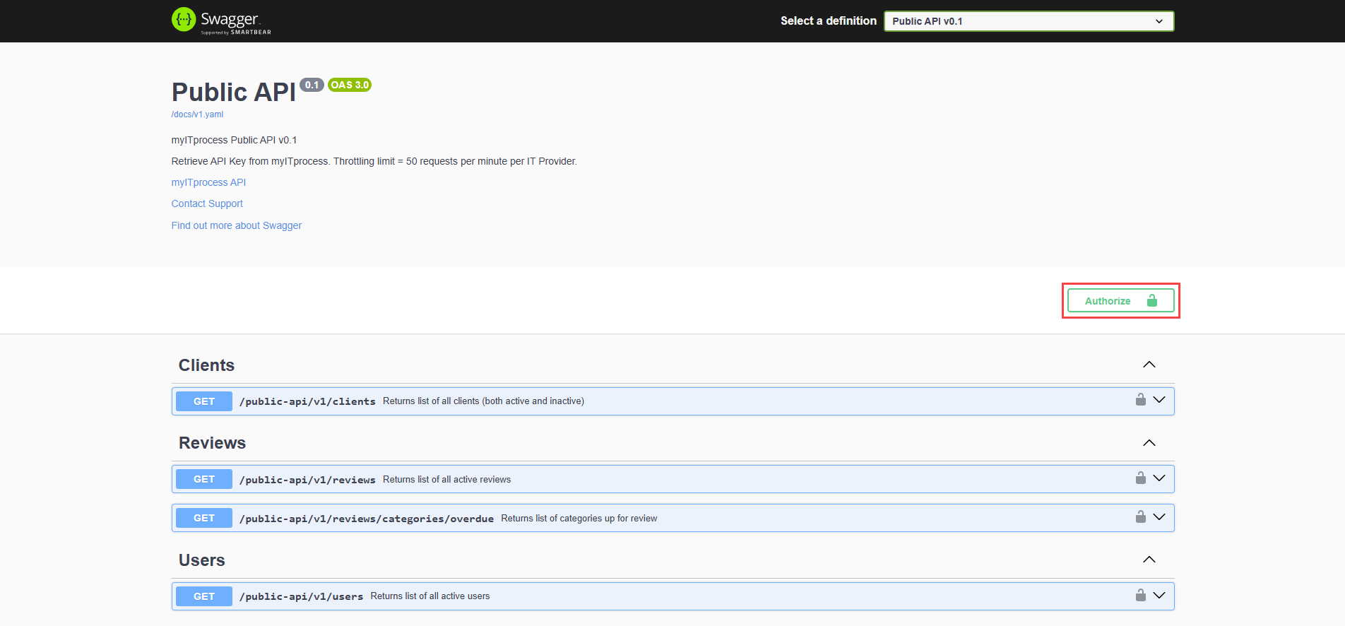 To get started, navigate to the myITprocess Public API page in Swagger UI.