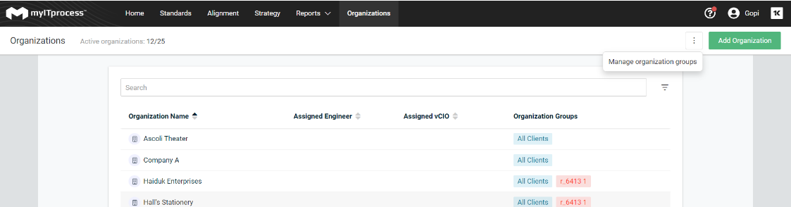 - To get started, click Organization on the menu bar. Click the three vertical dots menu next to the Add Organization button and select Manage organization groups.