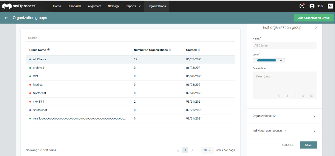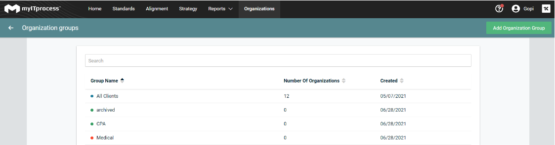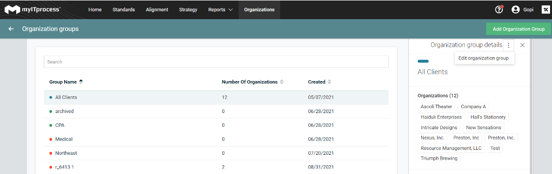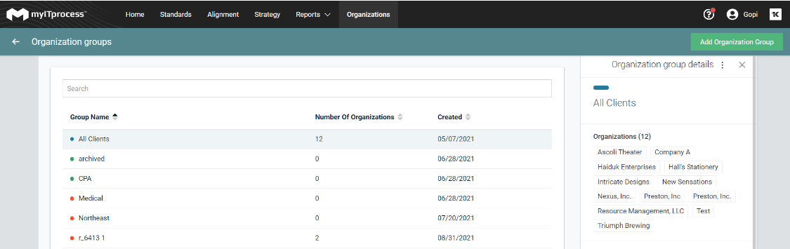 By default, all organizations are added to a group titled All Clients. This group is visible to all users. Creating specific organization groups (by geography or vertical) allows you to add users to that group and prevent those users from seeing other client data. Please note: in order to allow users to see only specific clients, those users will need to be removed from the All Clients group.