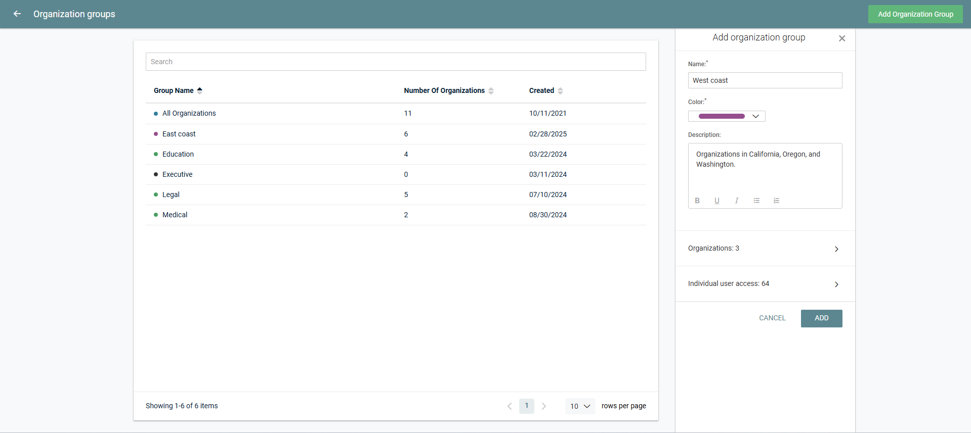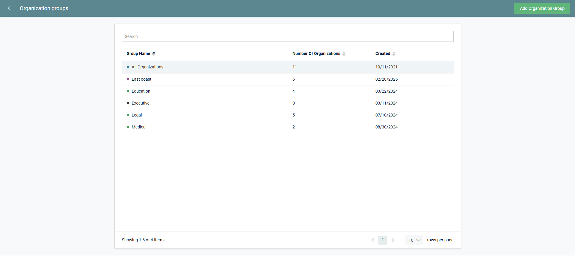 For each group, this list displays the color code selected for the group, name of the group, number of organizations included in the group, and date on which the group was created. The All Organizations group includes the total number of active organizations.