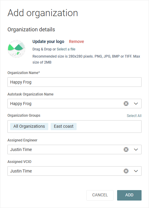 - Optionally, from the remaining drop-down menus, assign any user from your account as the engineer for the organization and either that same user or a different user as the Virtual Chief Information Officer (vCIO) for the organization.