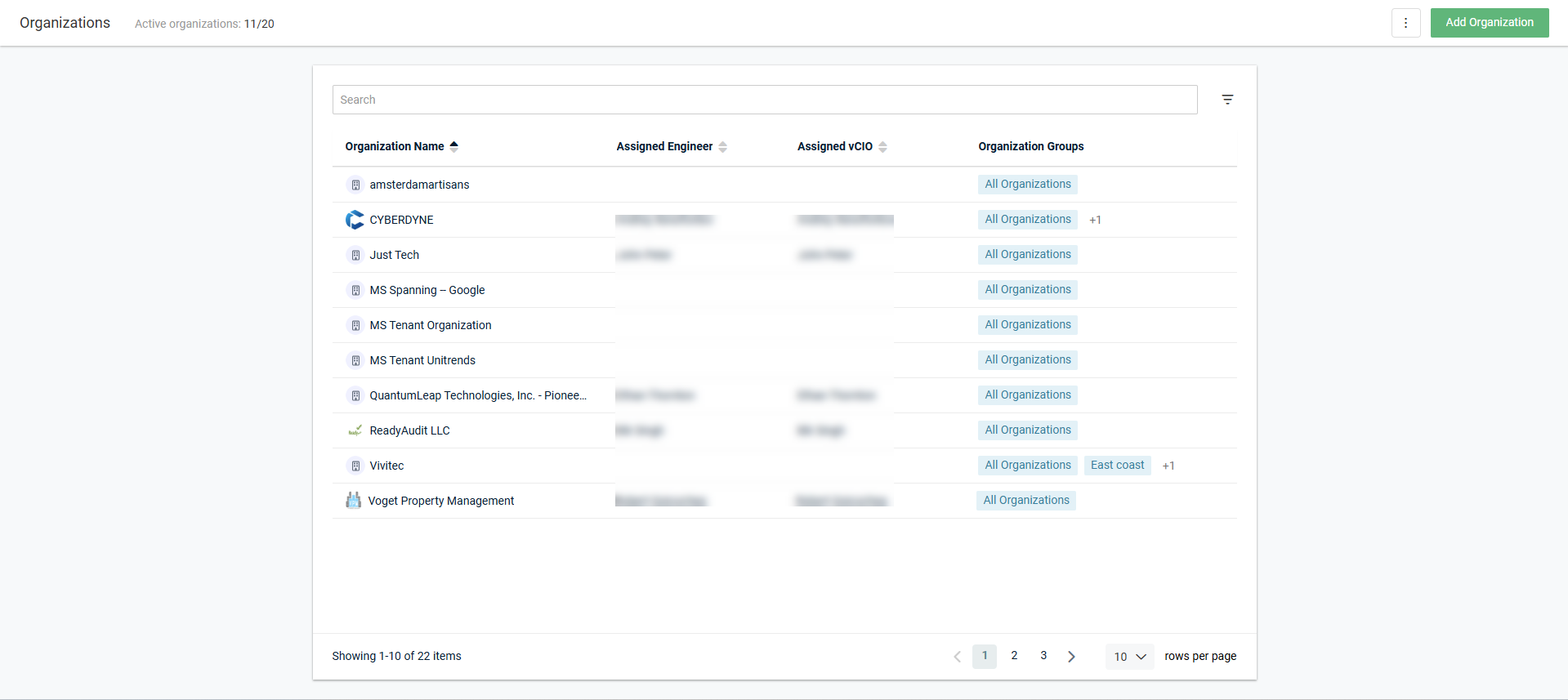 You can sort the Organization Name, Assigned Engineer, and Assigned vCIO columns alphabetically in ascending or descending order.