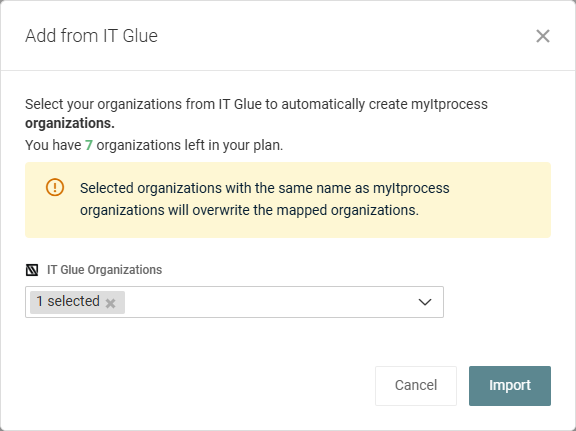 NOTE The number of IT Glue organizations you can import (based on how many myITprocess organizations you have remaining in your plan) is displayed, as importing IT Glue organizations will automatically create matching myITprocess organizations. Once you have selected the number of organizations you are permitted to create, the remaining checkboxes are grayed out.