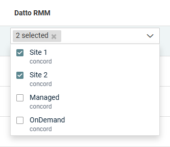 If Datto RMM sites are synced to myITprocess, you have the option to map multiple sites to a single myITprocess organization. To do so, select any number of Datto RMM site checkboxes from the Datto RMM drop-down menu for a myITprocess organization. Site‑specific views are available within meetings and QBR reports.