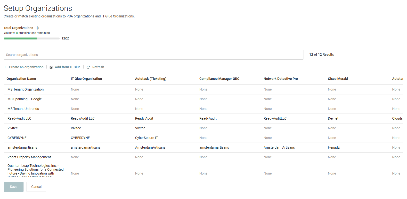 The list of organizations on the Setup Organizations page displays a column for each of your integrated applications, including any modules synced from KaseyaOne. Use the horizontal scroll bar at the bottom of the list to view all columns.