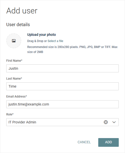 - Optionally, upload a headshot of the user in the Upload your photo field (280 x 280 pixels recommended), which will show as the user's avatar throughout the user interface. The file must be saved to your local device. Click and drag the file into the upload box or click Select a file.