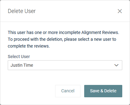 If the user has one or more alignment reviews in progress, select a different user to complete the reviews from the Select User drop-down menu, and then click Save & Delete to reassign the review(s) and permanently remove the user.