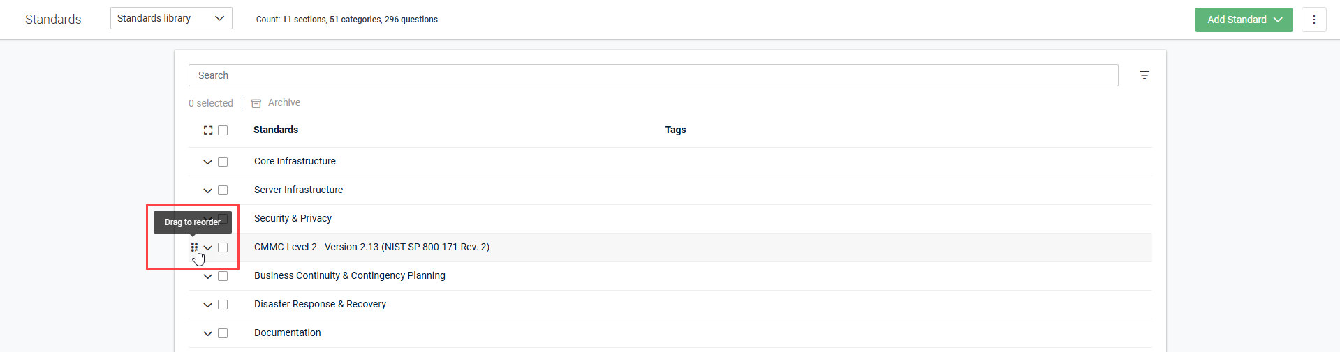 - If a section, category, or question is outdated or no longer relevant, you should archive the item rather than overwriting it with different content. This ensures historical data associated with past reviews does not become unreliable. Refer to Archiving a section, category, or question in the Standards Library.