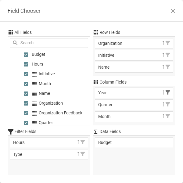to open the Field Chooser window, which allows you to configure all field selections (adding or removing certain columns or rows), sorting, and filtering from one location.