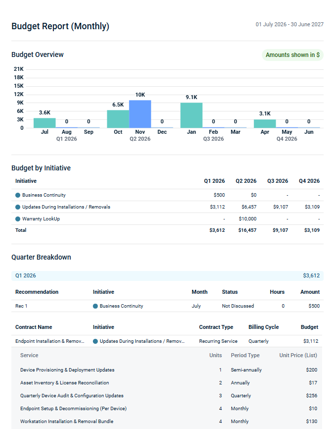 The Budget Report section within the QBR Report Builder provides a budget view for an individual organization based on its Strategic Roadmap recommendations and contracts.