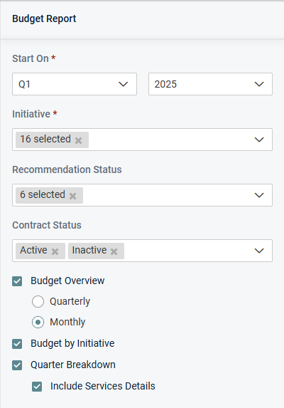 If you choose to include the budget overview, select Quarterly or Monthly to control how the bar chart data is displayed for the configured Start On timeframe.