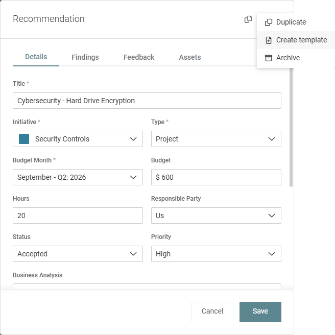 - Enter an estimate of the number of hours that will need to be implemented. Recommendations created from this template will derive these hours by default.