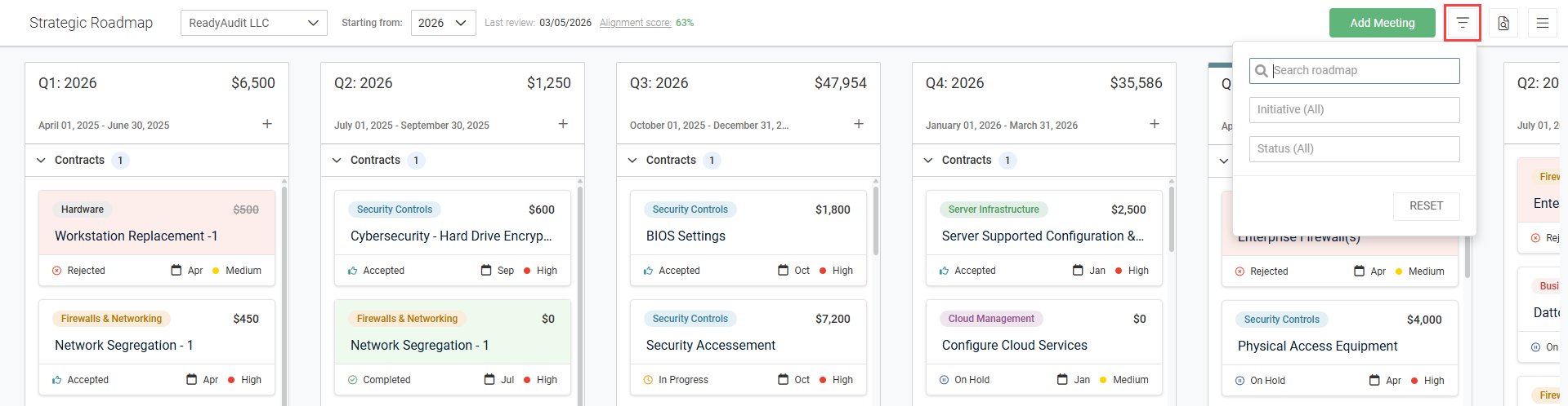 - Initiative: From the drop-down menu, select one or more initiatives to filter the roadmap by recommendations and contracts assigned to the selected initiative(s). With no filtering, recommendations and contracts from all active initiatives are displayed.