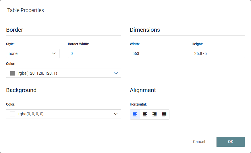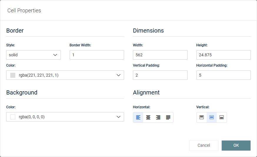 - Apply a background color to all cells (instead of white). When selecting the color, adjust the Alpha value (on a scale of 0 to 1) to control the intensity and saturation of the shade applied to the table. You can click and drag the color scale bar to choose the desired look.