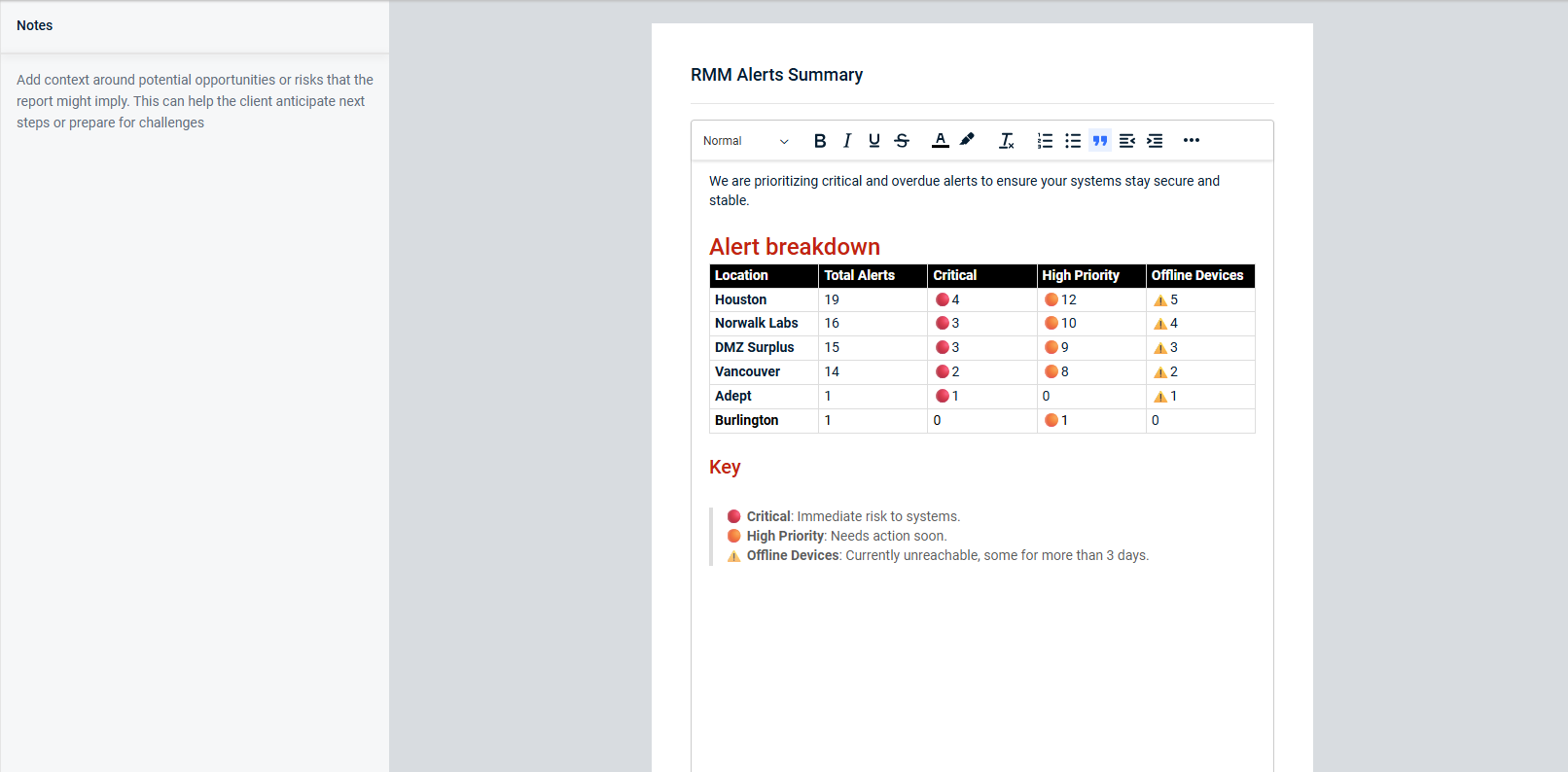 Business notes in the QBR Report Builder help MSPs bridge the gap between technical data and executive understanding by adding human context, strategic insights, and clarity to every QBR report. Refer to Using the QBR Report Builder.