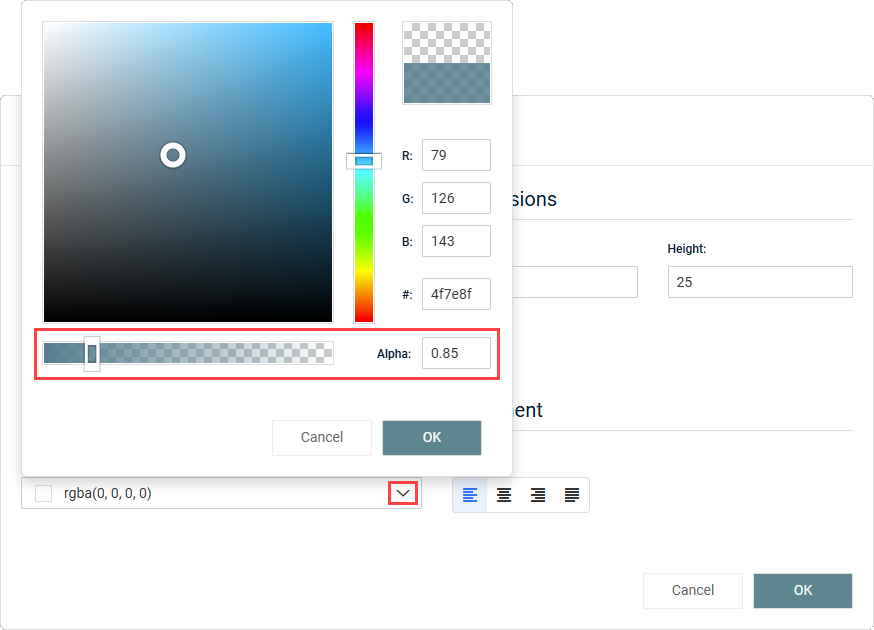 - Apply a background color to the selected cell(s) (instead of white). When selecting the color, adjust the Alpha value (on a scale of 0 to 1) to control the intensity and saturation of the shade applied to the cell(s). You can click and drag the color scale bar to choose the desired look.