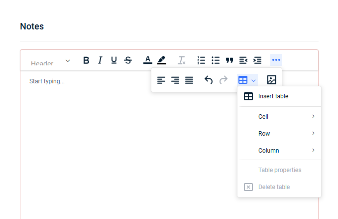 - To format the overall table design, click anywhere in the table and select Table properties from the table drop-down menu.