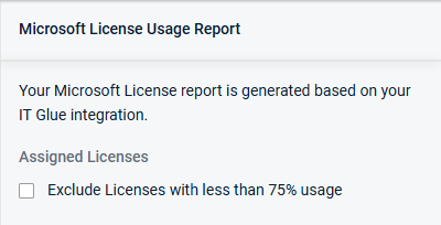 Selecting the Exclude licenses with less than 75% usage checkbox hides licenses with low utilization from the report.