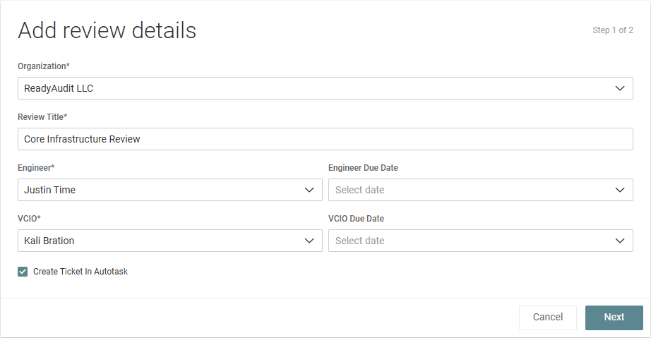 - Optionally, from the Engineer Due Date and vCIO Due Date drop-down menus, select the date by which these portions of the review should be completed.