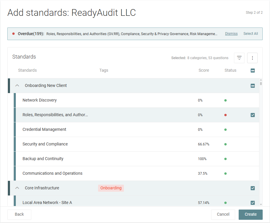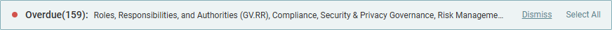 - If the organization has overdue standards, they appear in a banner at the top of the page. Overdue standards refer to categories up for review, meaning those categories have passed the reminder date set for them in the Standards Library. Either click Dismiss and manually select sections and categories in the subsequent steps, or click Select All to automatically select those overdue categories and their parent sections to include in the review.