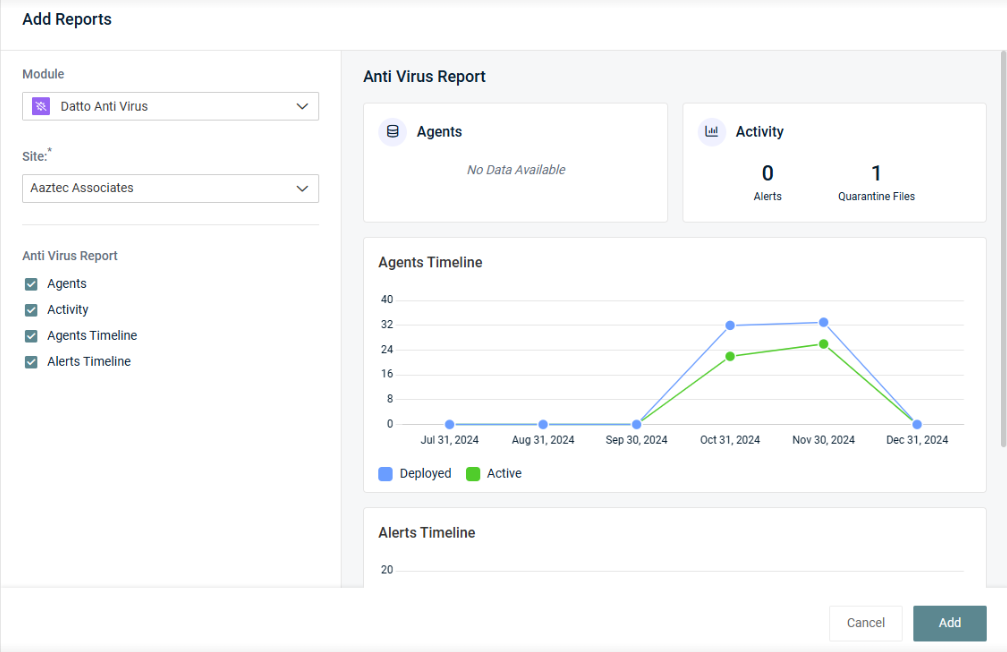 - Site: This field is only available for the following modules: Datto EDR, Antivirus, Network Detective Pro and BMS where site data is synced from the respective module.