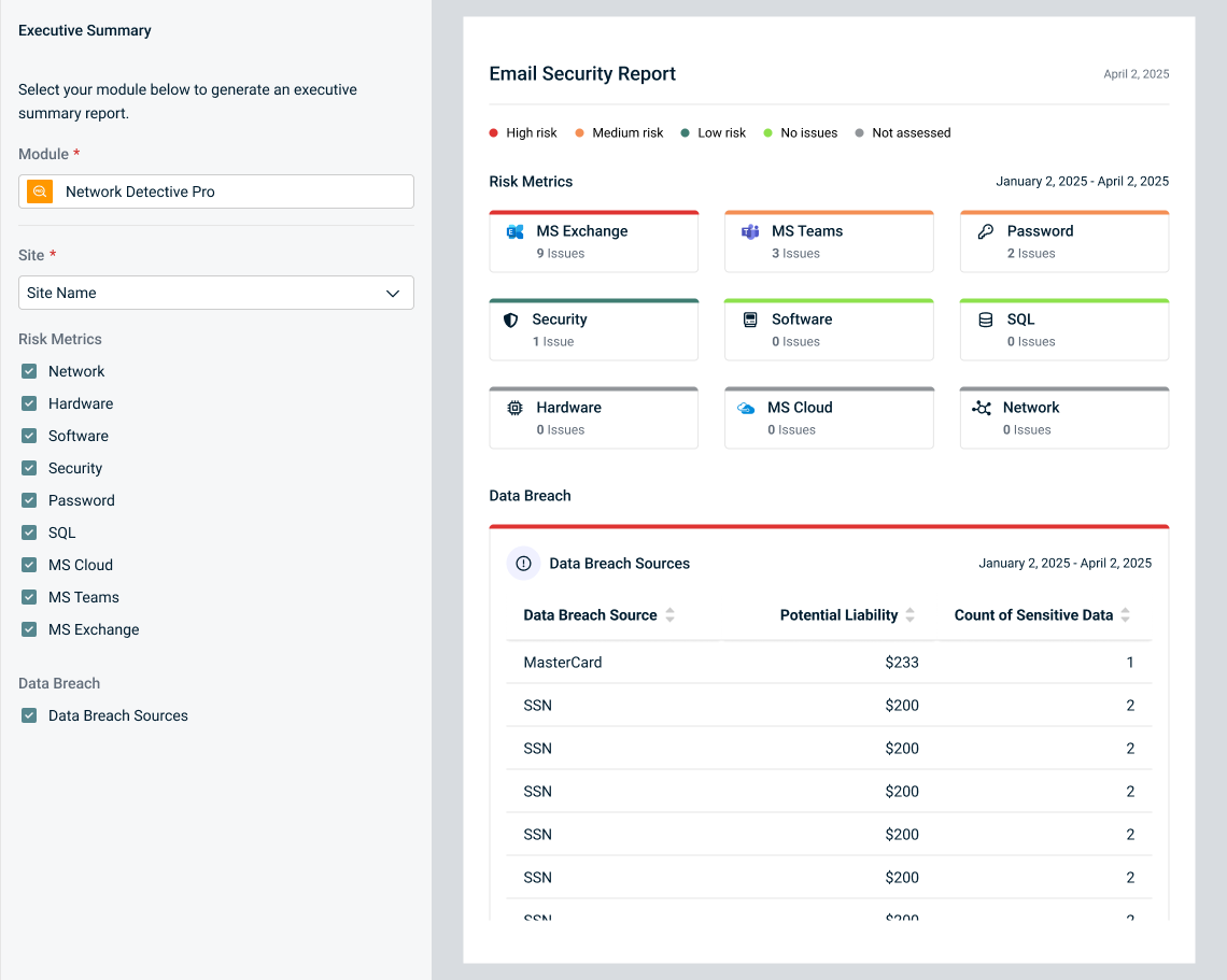 Network Detective Pro Executive summary gives an overview of the network security issues that were identified within the last 30 days: