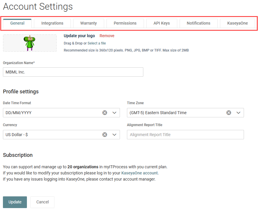 Add your company logo, change your company name, configure your global account settings, and view your subscription details.