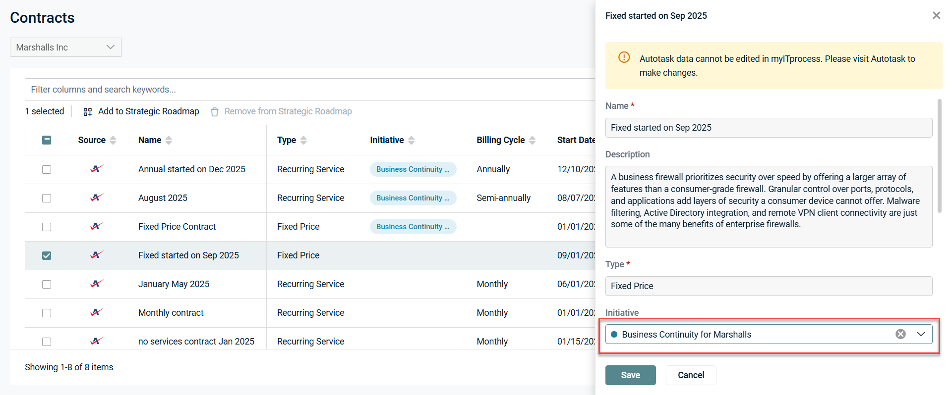 Opting to sync Autotask contracts into myITprocess completely centralizes your contract management to track recurring investments. Streamline lifecycle tracking, protect revenue, and link agreements directly to IT roadmaps, budgets, and KPIs to drive smarter planning and higher-impact QBRs.