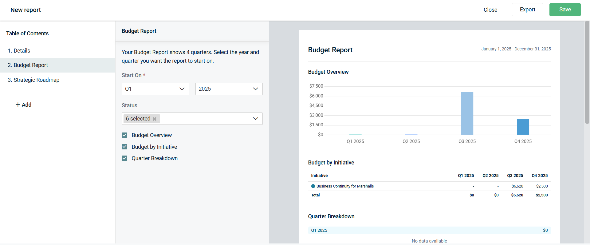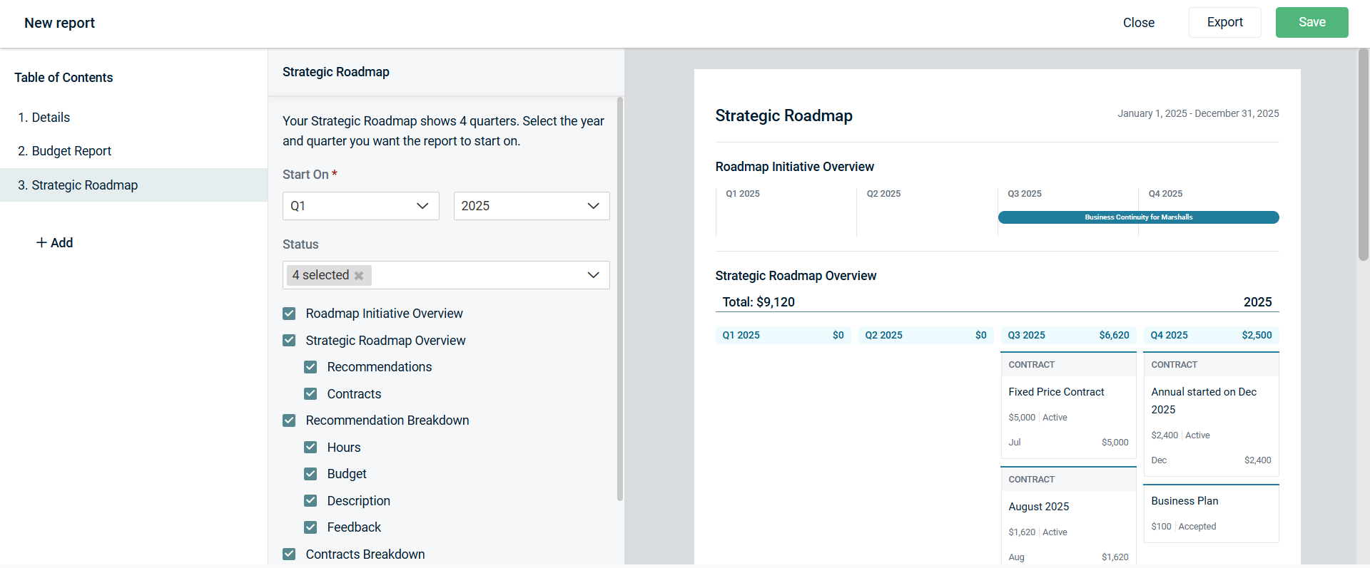 - In the Table of Contents section on the left side of the page, click Add. From the list of report options, select Budget Report or Strategic Roadmap. You have the option to add both options in one report, more than one Budget Report in one report, and more than one Strategic Roadmap in one report.
