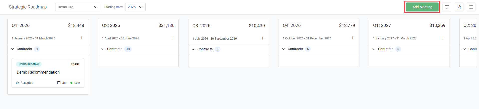 - Drag and drop one or more contracts into the box to add them to the meeting agenda. You have the option to add the same contract from different quarters to the meeting. Each contract tile in the meeting agenda displays the applicable quarter and quarterly cost.