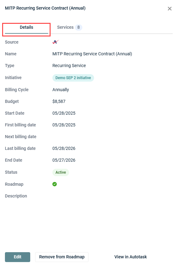 Source | The Autotask logo indicates the contract is synced from Autotask. | |