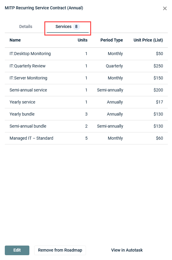 For Recurring Services contracts, the Details tab and Services tab are displayed. For Fixed Price contracts, the Details tab and Milestones tab are displayed.