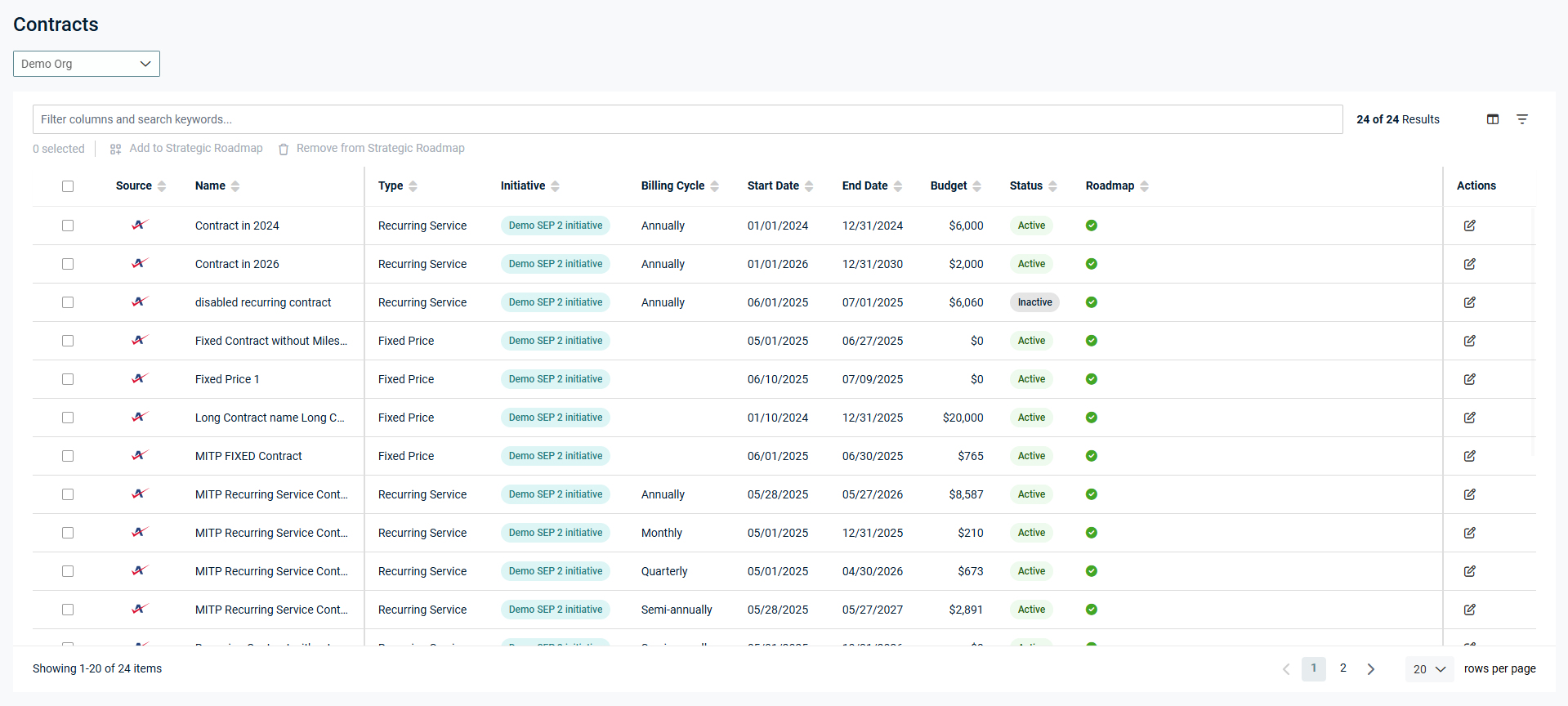 Use the filter menu in the upper-right corner of the page to search or filter for specific contracts by name or initiative.