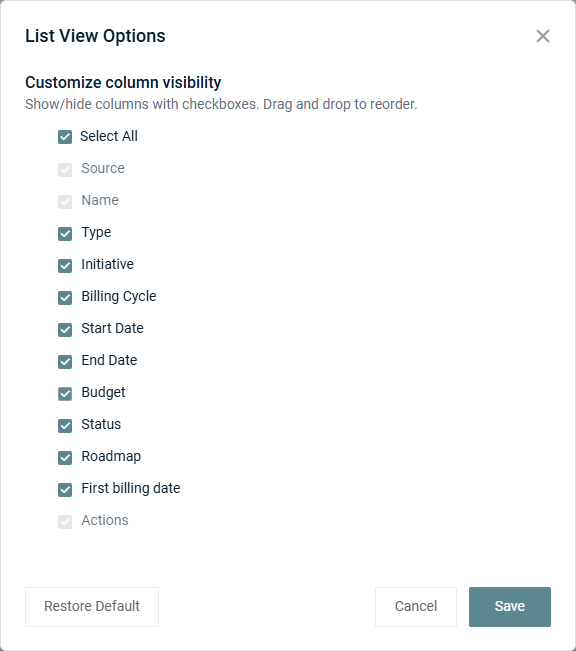 NOTE The Source, Name, and Actions columns cannot be hidden from the list.