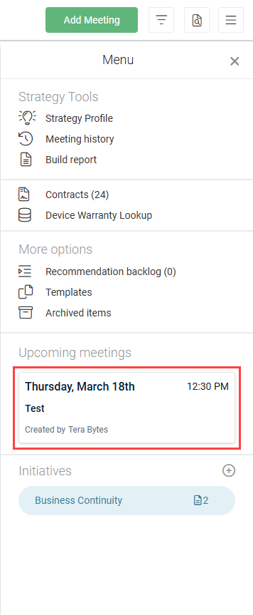 To help drive meeting agendas, contracts added to the roadmap can be added to meetings from the Strategic Roadmap page. Complete the following steps to add one or more contracts synced from Autotask to a myITprocess meeting: