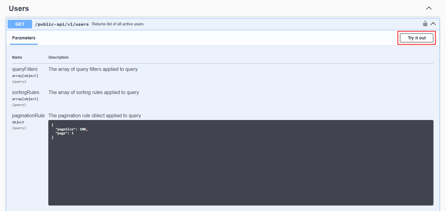 - Click Try it out for the desired endpoint.
