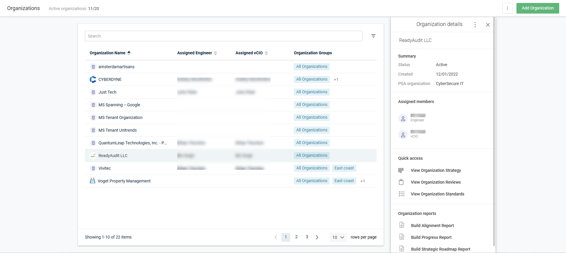 You can sort the Organization Name, Assigned Engineer, and Assigned vCIO columns alphabetically in ascending or descending order.