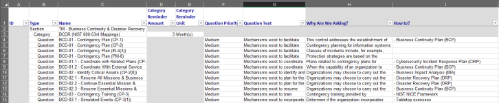 The other column is Function Grouping. This column puts questions from each domain into its own control group—like NIST 800-171. The groups listed are Identify, Detect, Respond. Protect, and Recover. These categories are useful when prioritizing groups of questions into categories.