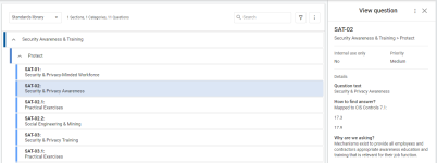 In the example below, I used the Secure Control Framework (www.securecontrolsframework.com) to create a custom template around their ‘Security Awareness & Training’ domain. This is a simple illustration of how training implementation uses the Standards Library and that ongoing education is usable.