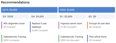 The Recommendations section above is an example from the Strategic Roadmap Report. In essence, adding it to the Roadmap keeps the topic persistent for every client meeting. Constant reminders of the importance, cost, and time commitment are present on every report. Moving a recommendation to future quarters is a great feature. When a recommendation is on hold, moving to the next meeting shows the vCIO is a strong advocate of user training.