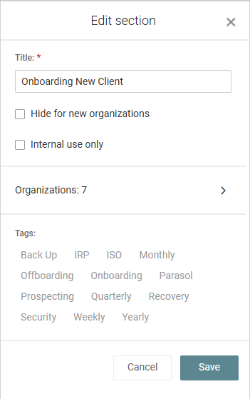 For more information, refer to Including or excluding sections and categories in organization templates. - Optionally, in the Tags section, click any number of tags to apply to the section, which you can filter by in multiple locations. Refer to Managing Standards Library tags.